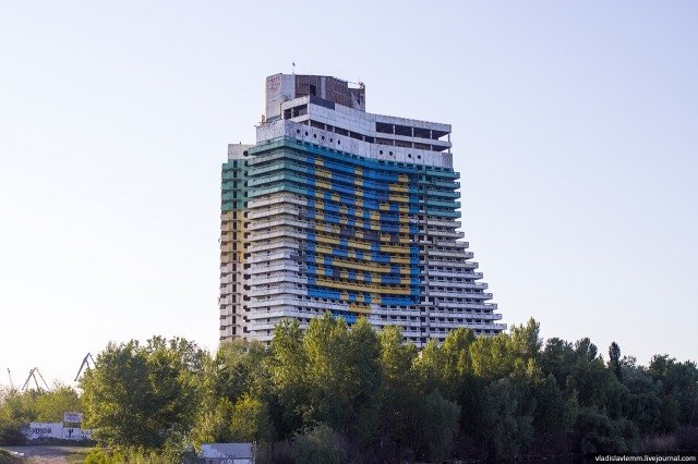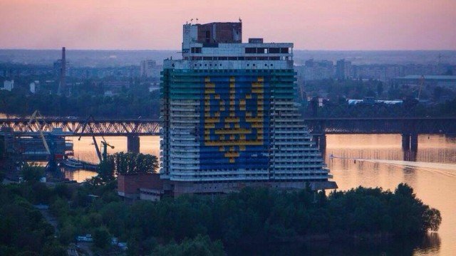 Одну з найвищих споруд Дніпропетровська – недобудований готель «Парус» – розмалювали у національні кольори, розмістивши на фасаді будинку державний герб України.