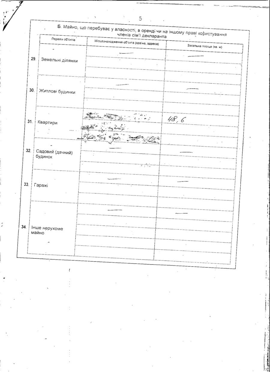 У власності декларанта є земельна ділянка загальною площею 800 кв. м. та квартира – 51,7 кв.м., у власності членів сім’ї - квартира загальною площею 48,6 кв. м.