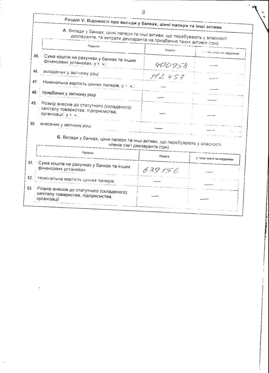 Сума коштів декларанта на рахунках у банках та інших фінансових установах становила 400 958 грн, з них - 112 457 грн вкладені у звітному році.
