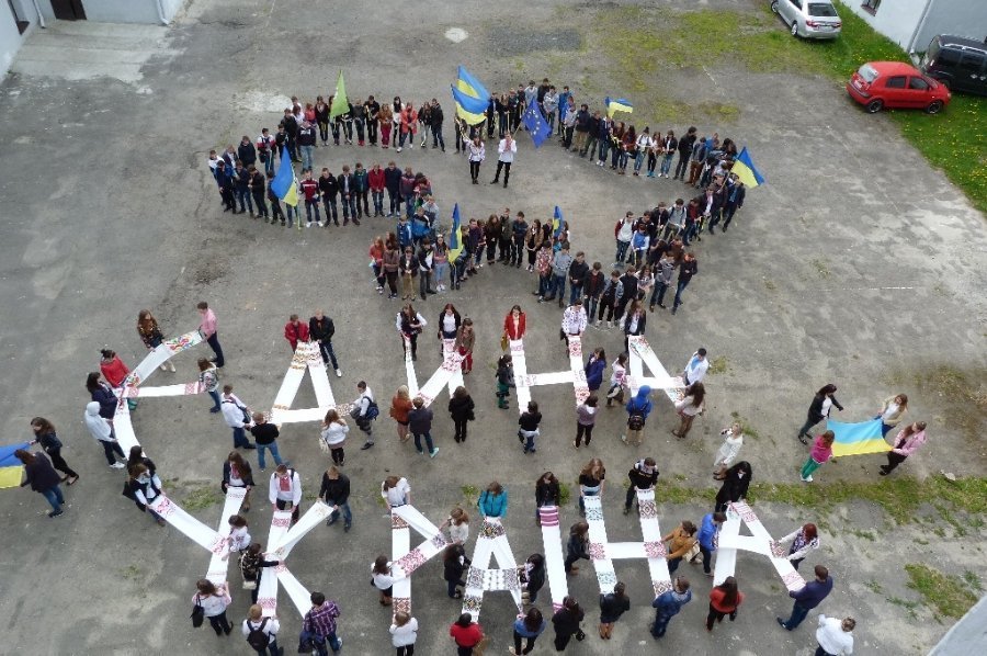 Cтуденти і викладачі Волинського технікуму Національного університету харчових технологій провели патріотичний флешмоб, склавши з вишиваних рушників фразу "Україна єдина".