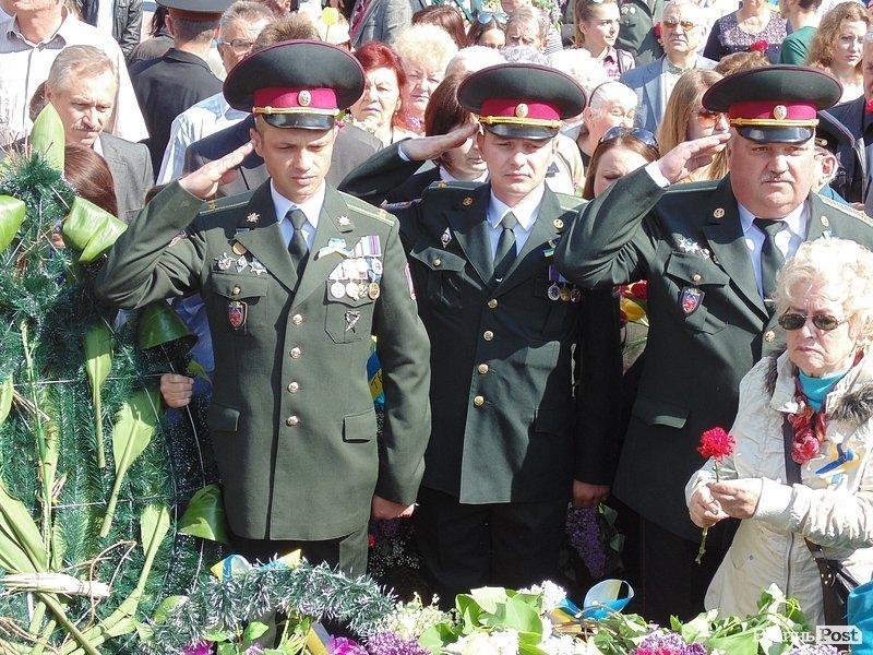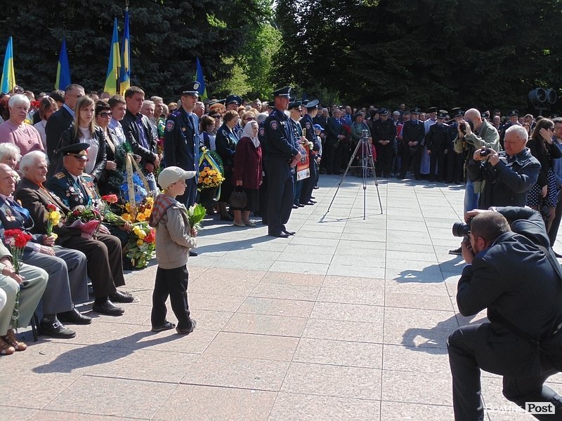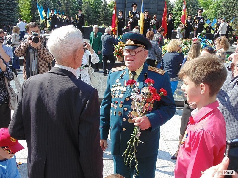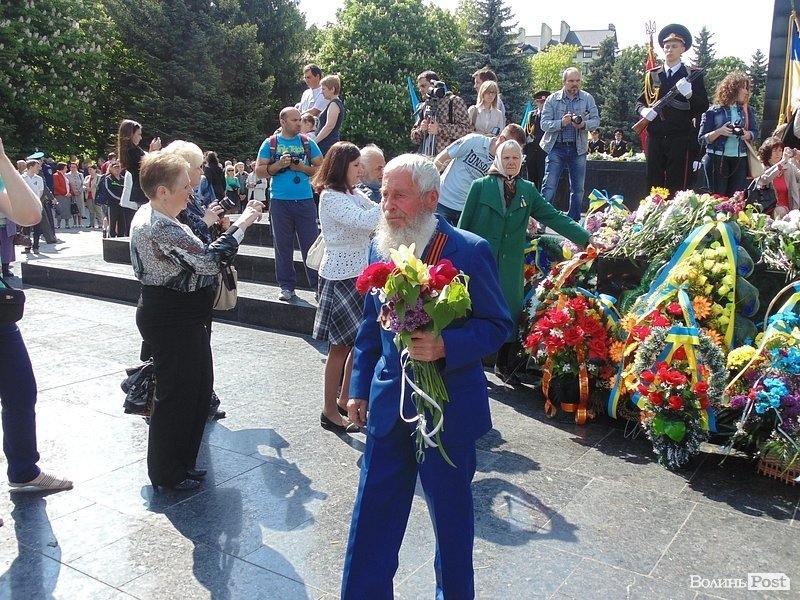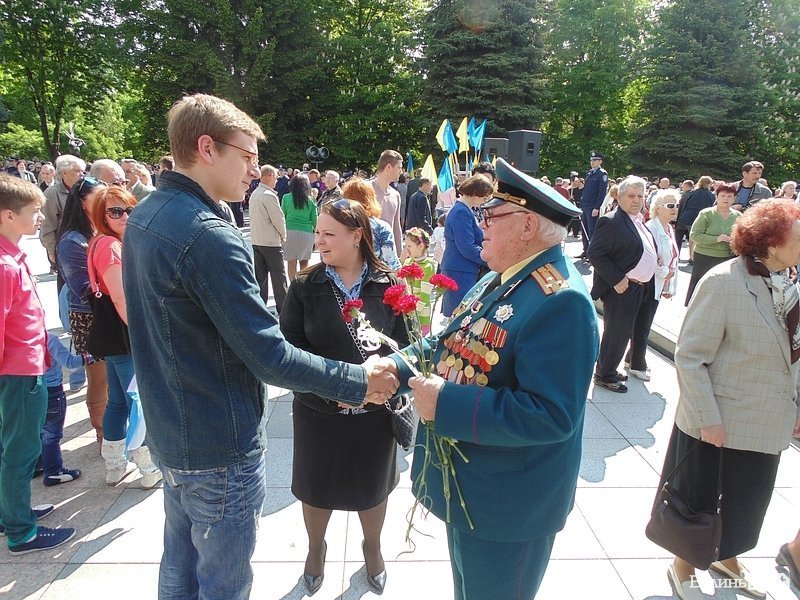 Квіти до Меморіалу вічної слави клали силовики, ветерани, посадовці та прості громадяни. Також дарували багато квітів ветеранам. Дехто із них прийшов із георгіївськими стрічками, однак «ветерани мають на це право, вони боролися за нас, вони ж не сепаратисти», - пояснив один із силовиків.
