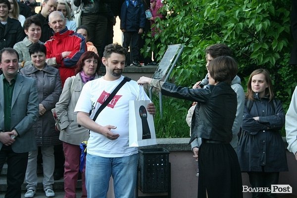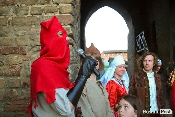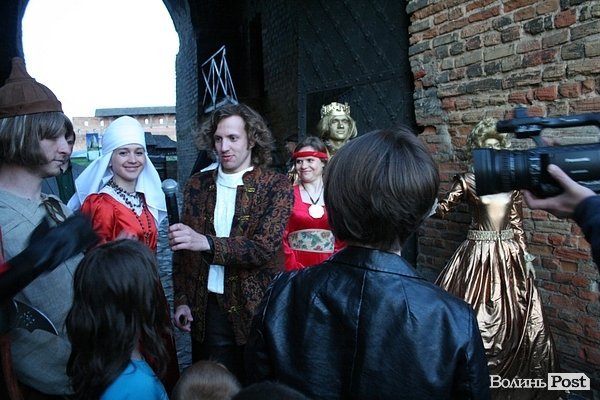 Крім того, розігрували подарунки серед глядачів. Керівник театру і екскурсовод Руслана Порицька задавала питання з історії Луцька. Перший. хто відповів, отримував подарунок.