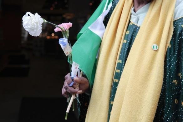 Жінка тримає гвоздику, беручи участь у молитові за викрадених нігерійських школярок за межами Генерального консульства Нігерії в Манхеттені, Нью-Йорк 10 травня 2014. Боко Харам викрав більше 250 дівчата з середньої школи в Chibok в віддаленому північному