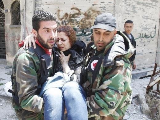 Чоловіки несуть поранену жінку після випадкового вибуху, викликаного залишками боєприпасів на Бустан аль-Диван, в старому Хомс Місто, 10 травня