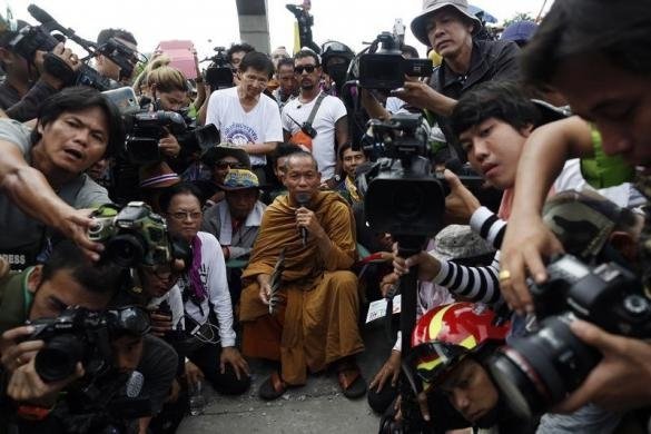Тайський буддійський чернець і протест лідера Луанг Пу Будди Іссара (C) оточений своїми прихильниками і журналістами