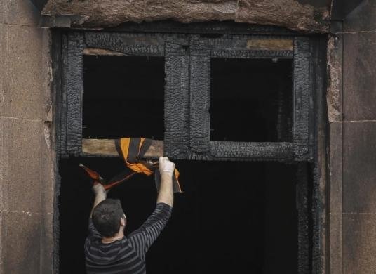 Зокрема є фото, як місцевий житель прив’язує георгієвську стрічку - символ, який пов'язаних з проросійськими акціями в Україні, до згорілого Будинку профспілок.