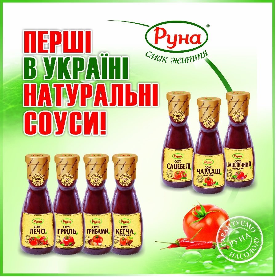 Компанія ПАТ «Луцьк Фудз», до якої входить ТМ «Руна», розпочала виготовляти натуральні соуси у скляних пляшках ємністю 235 мілілітрів.