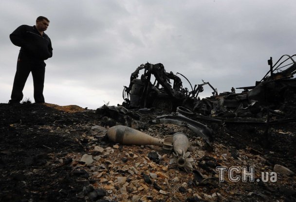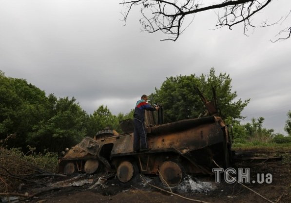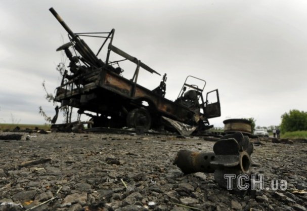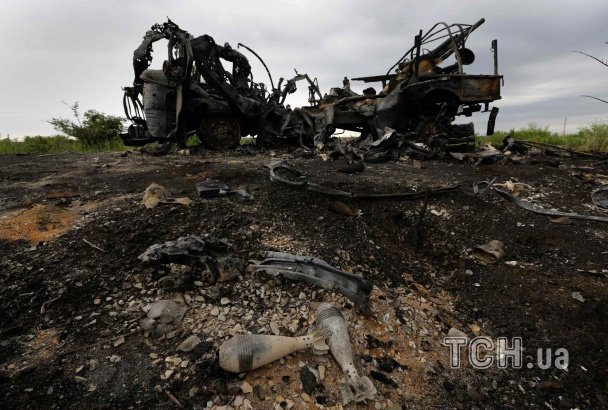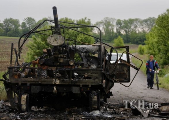 Про бойові дії поблизу села Октябрське, які проходили 13 травня, тепер нагадують залишки вщент згорілого БТРу, військової вантажівки та залишки мінометних снарядів.