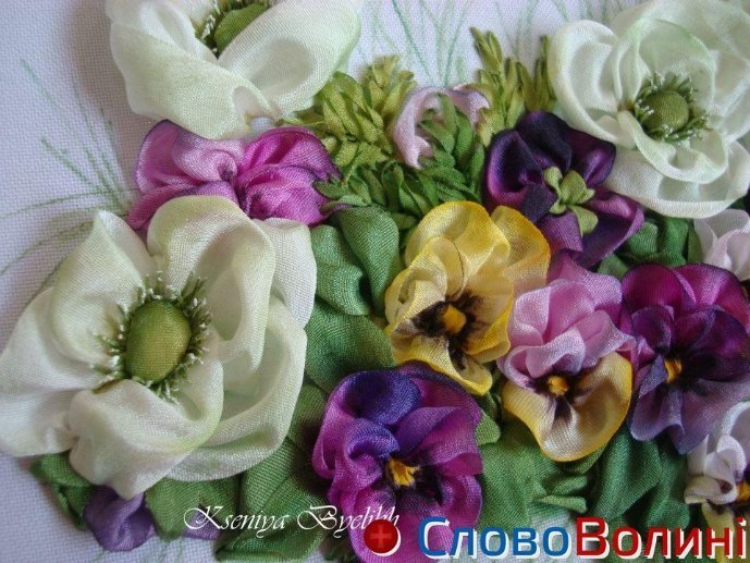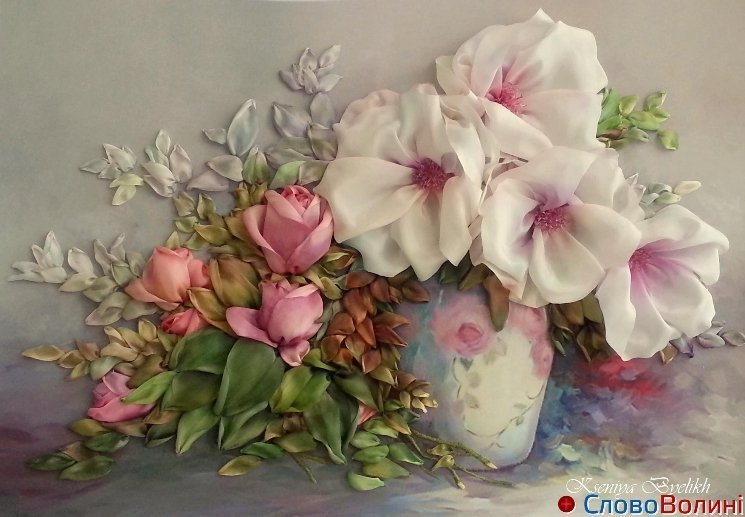 «Коли наштовхнулася на роботи із шовкових стрічок, зрозуміла - моє. Збираючи відомості про вишивання стрічками, відкрила для себе роботи і техніку гуру у цій справі – Енн Кокс. Вона вишиває квіти так, що їх хочеться торкатися і здається, що вони пахнуть», - розповіла про своє захоплення Ксенія Бєлих.