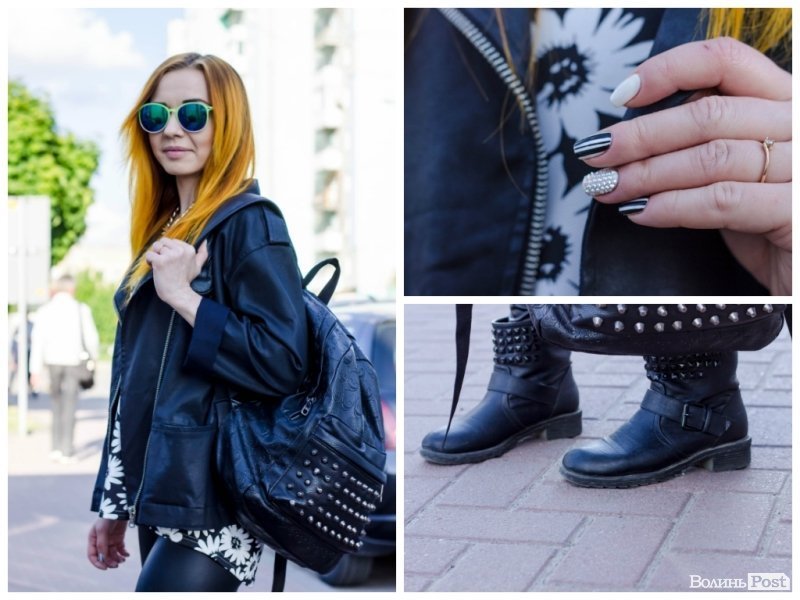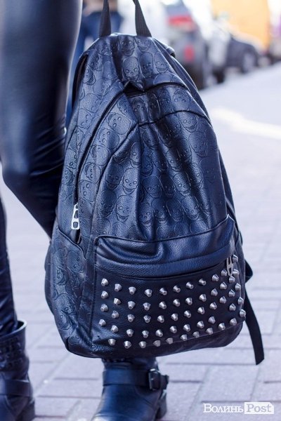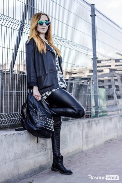 Дуже стильна дівчина. Правильно підібрані шкіряні штани із взуттям. Героїня в стилі glam rock. Рюкзак у неї модний – підходить до образу. Окуляри Style. Куртка з підкачаними рукавами в тренді.