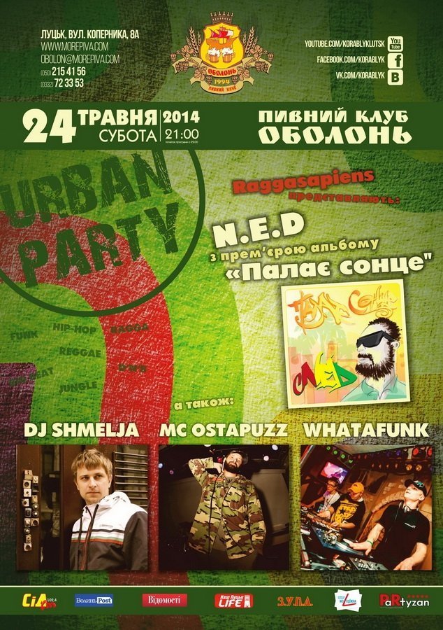 «Ну і знову чергова порція ламаних ритмів! Після довгої перерви у нас знову з'явилась можливість зробити чудовий вечір урбан-культури. Цього разу до нас вже вдруге завітає N.E.D (разом із своїм "колегою по цеху" з Raggasapiens - Dj Ostupuzz), який на цей раз презентує дебютну платівку "Палає сонце", на яку вже давно всі зачекались. Разом із вищезгаданими козаками атмосферу вечора будуть ще ліпити Dj Shmelja та луцький WhataFunk», - розповідають в закладі.