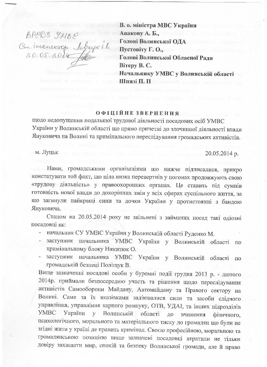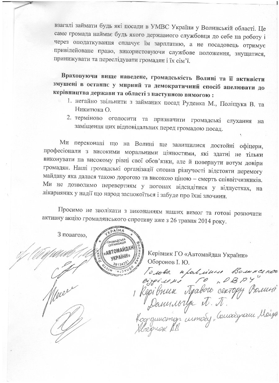Волинські революціонери просять керівництво МВС та регіону звільнити трьох заступників начальника обласної міліції.