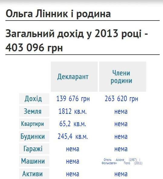 Пані Лінник та члени її родини торік зуміли наповнити сімейний бюджет на більш ніж 403 тисячі гривень. Зокрема декларант отримала сукупний дохід менше від 140 тисяч гривень. Із них понад 30 тис грн. – зарплатня, 1893 грн – дохід від оренди, 107,3 тис грн. – інші види доходів.