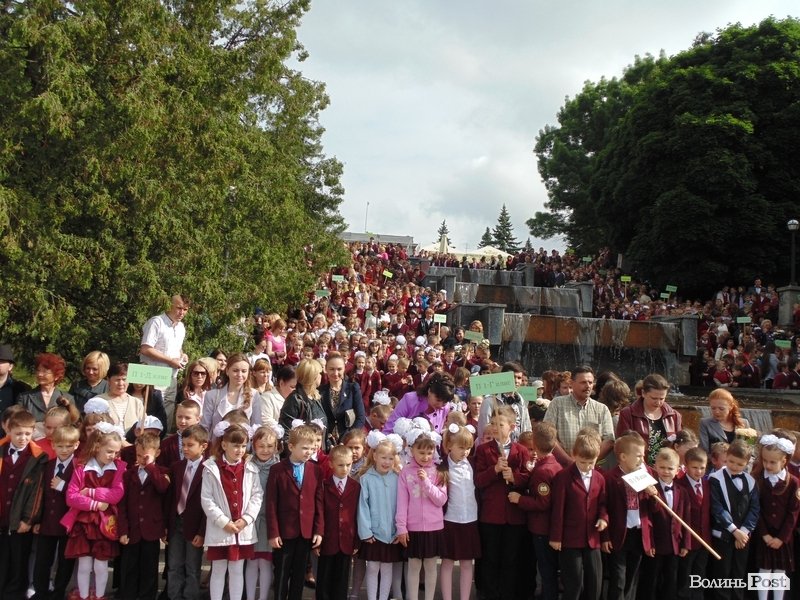 Перед початком дійства вони влаштували своєрідний флешмоб, ставши на сходах, які ведуть у парк. "Першачки" зайняли найвищі сходинки, а випускники стояли унизу.