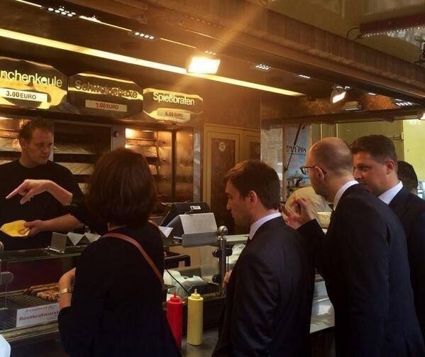"Прем'єр-міністр України і посол України в ФРН (Павло Клімкін, на фото – ліворуч від Яценюка) купляють сосиски в кафе, Аахен, 29.05", - ідеться в підписі до світлини, розміщеної в Twitter.