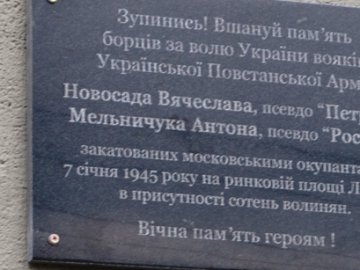 За дорученням міськвиконкому працівники «Луцького спецкомбінату комунально-побутового обслуговування» виготовили точну копію знищеної пам’ятної дошки воякам УПА, яких загинули від рук енкаведистів в січні 1945 року.