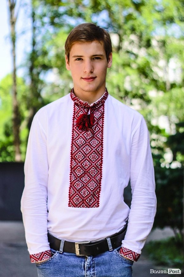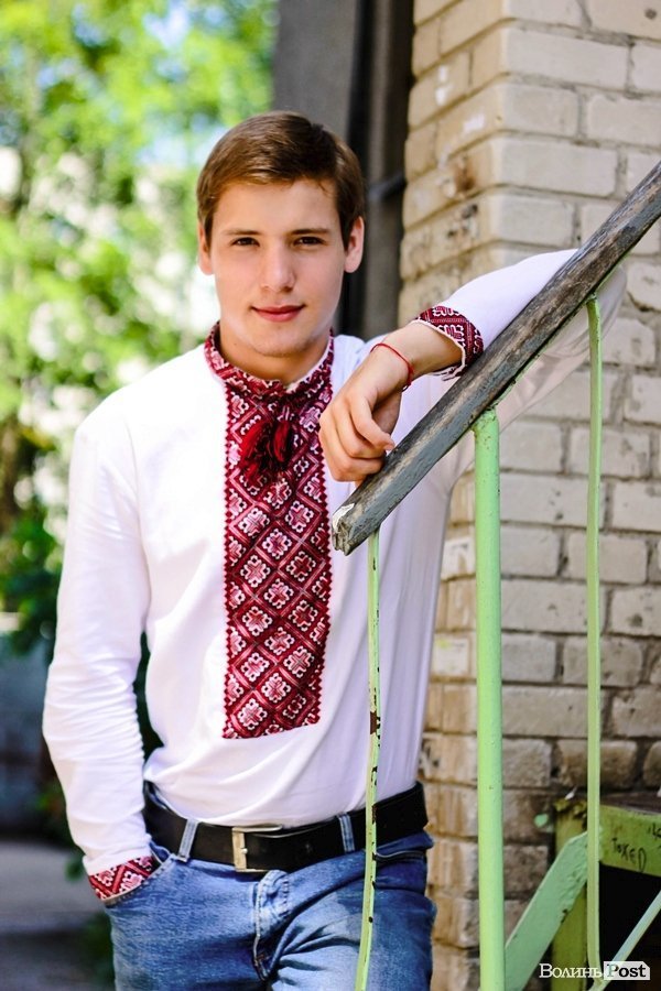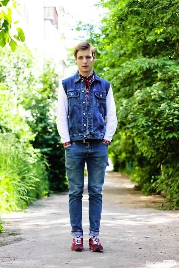 На фото хлопець одягнений у жилетку, джинси WRANGLER, сорочку, яку йому вишила бабуся, взутий хлопець був у кросівки RЕEBOOK.