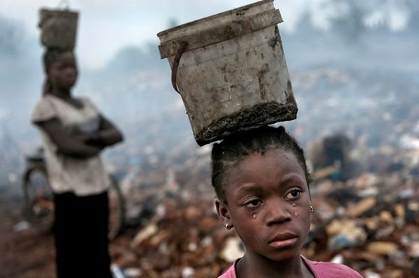 Вона разом з іншими дітьми порпається на звалищі електронних пристроїв в Аккрі, Гана. Несе відро із знайденим металом на голові та плаче через біль від малярії.