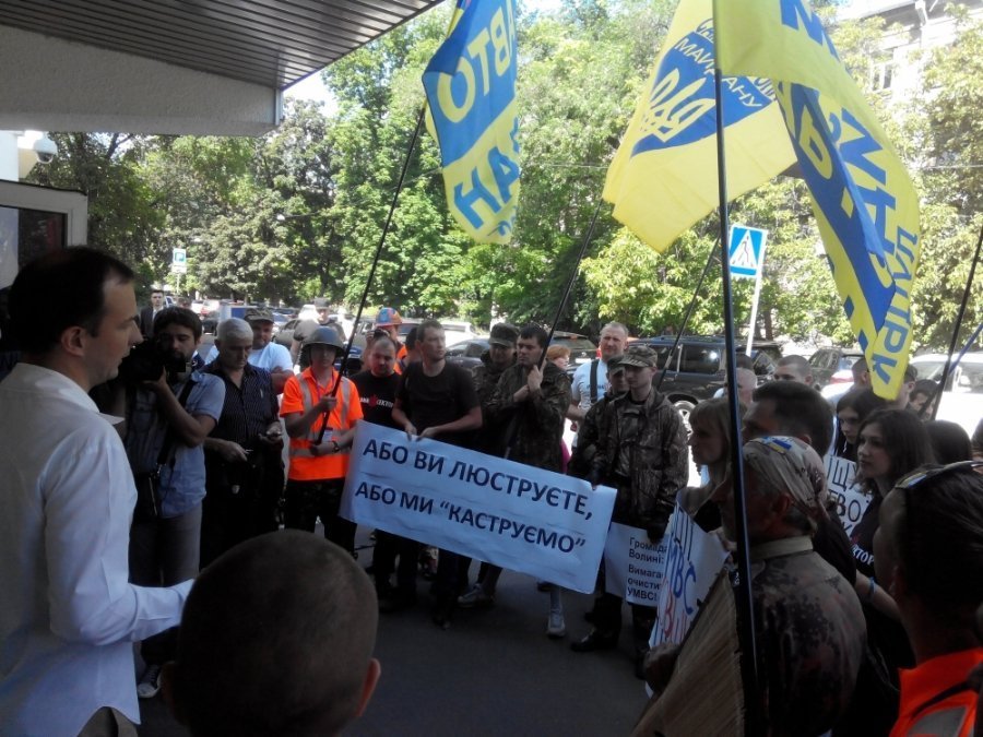"6 квітня ми взяли на себе відповідальність за начальрика УМВС в області. Але зараз склалась така ситуація, що у начальника МВС залишились заступники, які під час майдану займались переслідуаннями наших активістів це Олександр Никитюк, Микола Руденко Володимир Поліщук. Якщо зараз до нас не вийдуть ми будемо продовжувати акції протесту, поставимо намети тут досвід ми маємо",- прокоментував координатор "Самооборони майдану" Волині Богдан Климчук.