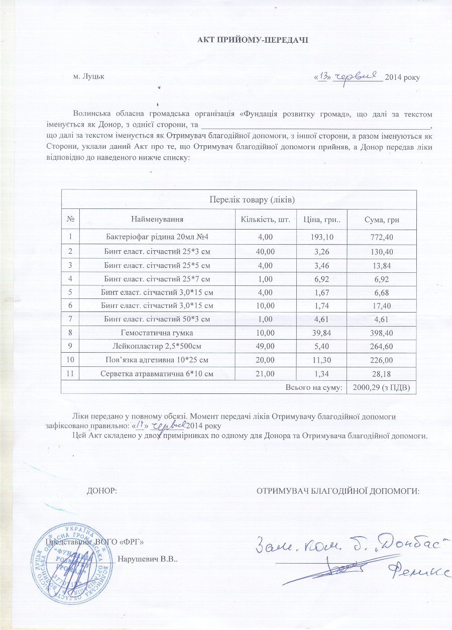 «Дякуємо всім, хто відгукнувся на прохання допомогти добровольцям. Ваш внесок безцінний. Велика подяка ДВТП «Волиньфармпостач», в особі директора Півнюка Михайла Івановича, який безкоштовно надав медикаментів, кровозупинних матеріалів на суму 2 тис.грн. та колективу Музею Волинської ікони», - кажуть в організації.