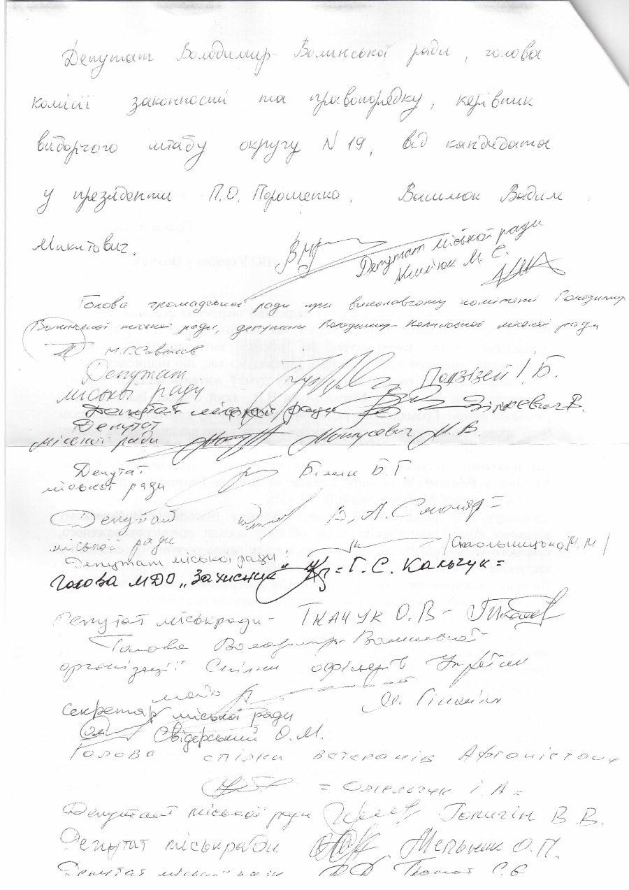 «Серед підписантів листа фігурують прізвища таких одіозних людей як депутат Володимир-Волинської міської ради, колишній заступник голови місцевих регіоналів та екс-голова «Молодих регіонів» міста Максим Климюк. А також такі депутати екс-«регіонали» як Валерій Зінкевич, Олег Мельник, Анатолій Смоляр, Іван Омельчук, Віталій Голигін. Раніше на підтримку Віталія Здомищука публічно висловлювався депутат Володимир-Волинської міськради Руслан Мороз, обраний від «Сильної України», який тепер судиться з активісткою Майдану Ольгою Нечитайло», - додають в прес-службі.