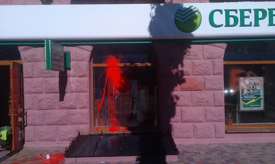 У Луцьку невідомі особи заляпали червоною фарбою вікна одного з відділень російського "Сбербанку".