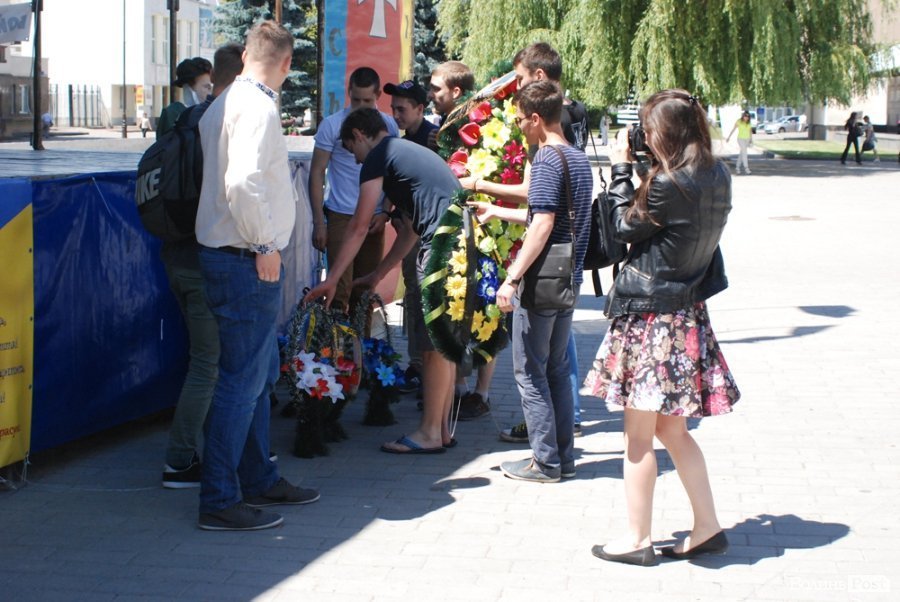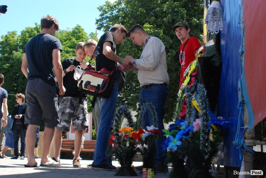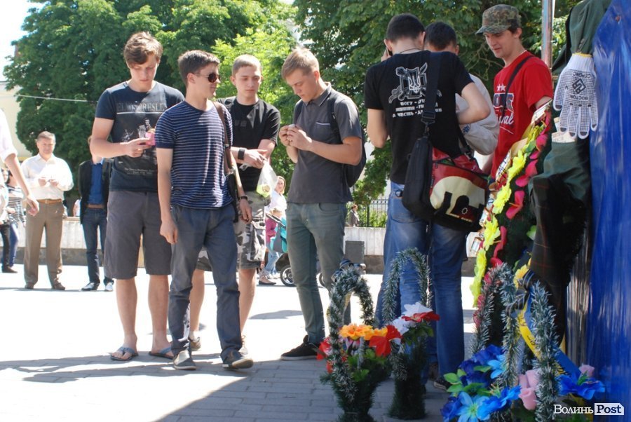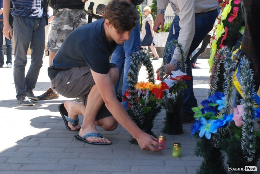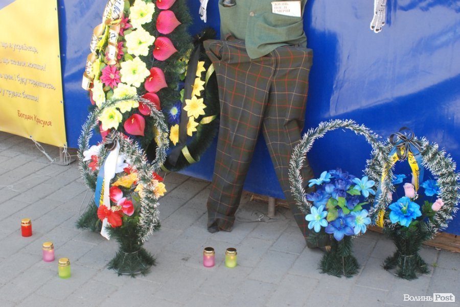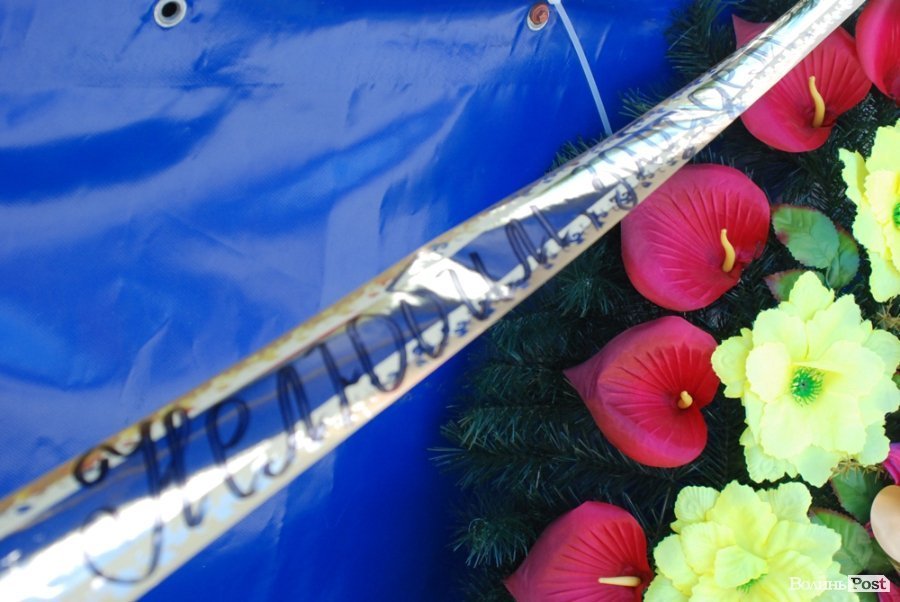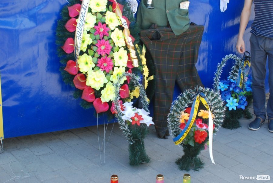 Біля конструкції поклали кілька вінків і запалили лампадки. На одному з вінків була стрічка з написом "Не любимо, забудемо".