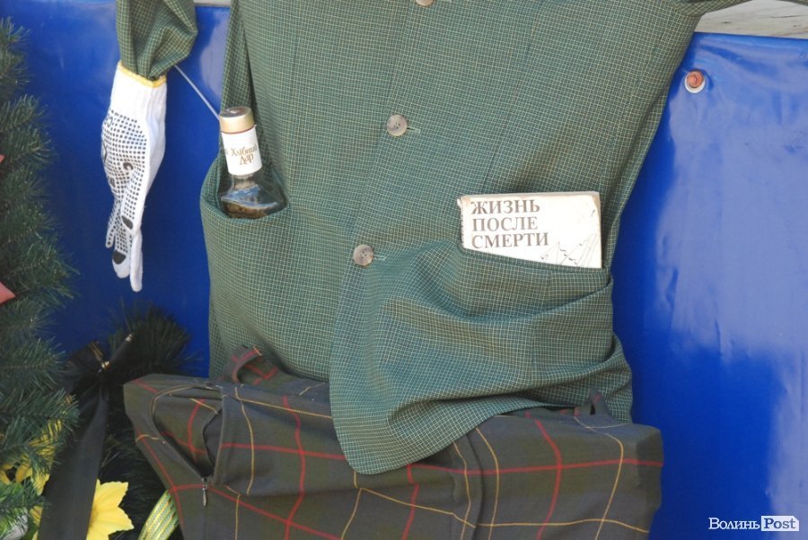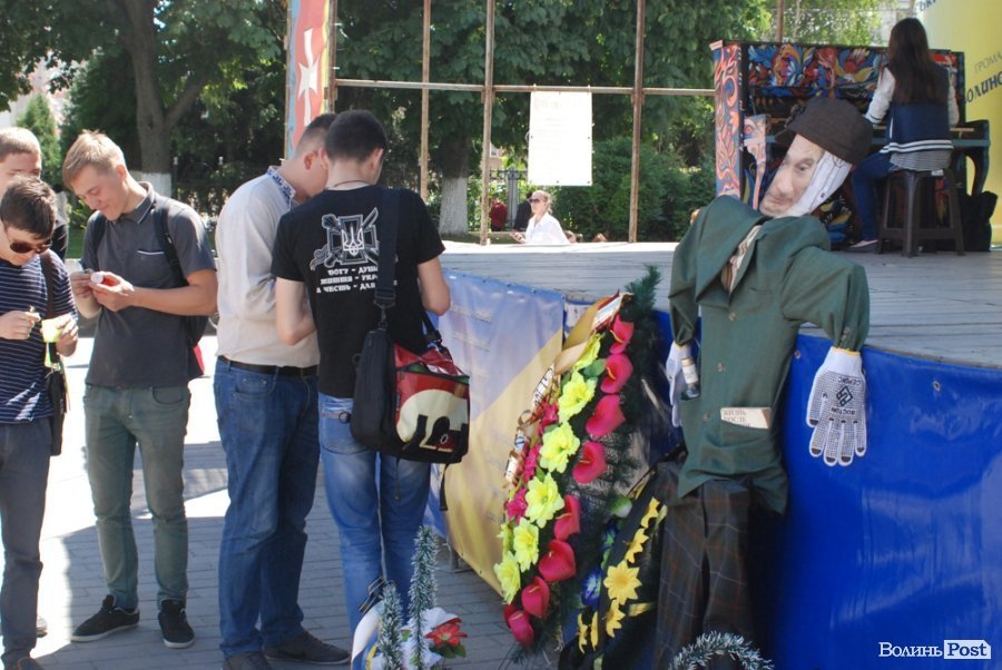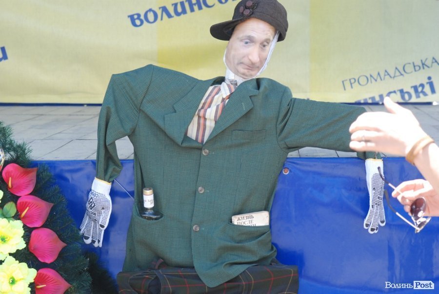 Акція розпочалася приблизно о 13:00. Громадські активісти принесли до сцени конструкції, схожу на людину, на яку одягнули штани, рукавиці, сорочку, піджак, а на місце, де має бути обличчя наклеїли фото президента РФ Володимира Путіна. З кишень піджака "виглядали" пляшка горілки та книга "Життя після смерті".