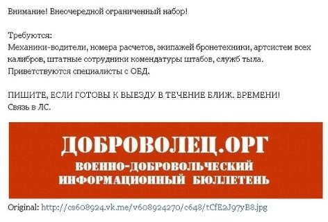 Портал "Доброволец.орг" також набирає охочих повоювати в Україні. Там потрібні спеціалісти по ПТРК (протитанковий ракетний комплекс), ПЗРК (переносний зенітно-ракетний комплекс), ЗРК (зенітно-ракентрий комплекс), АГС-17 (автоматичний гранатомет станковий, а також вогнеметальники, гранатометники та екіпажі БМ (бойових машин).