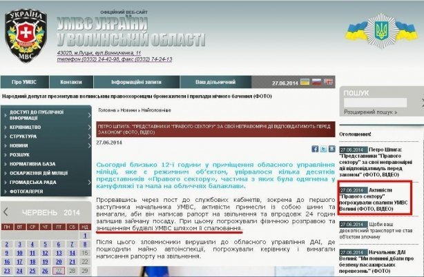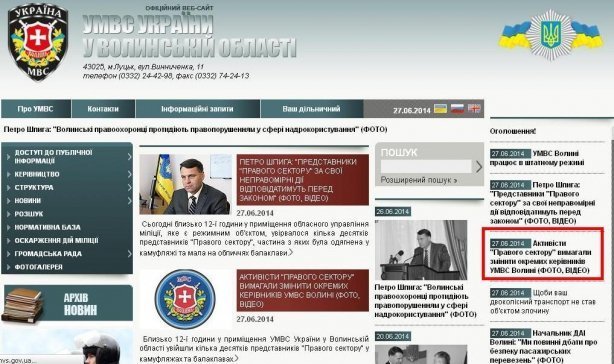 Із офіційних сайтів МВС та УМВС Волині зникла інформація про те, що активісти «Правого сектору» погрожували спалити приміщення міліцейського облуправління