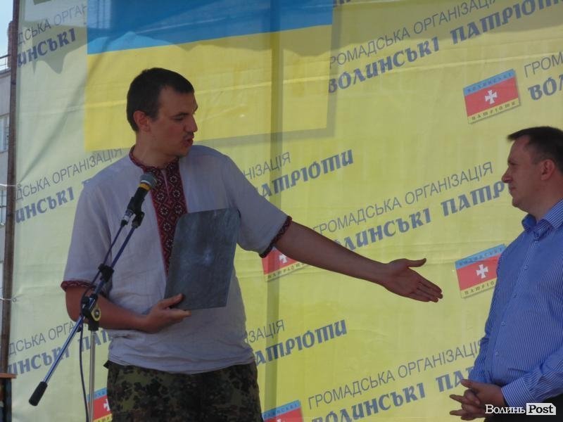 Зі сцени луцького Майдану під час віча бронежилет презентував заступник керівника штабу «Самооборони Волині» з матеріально-технічного забезпечення Сергій Чуріков.