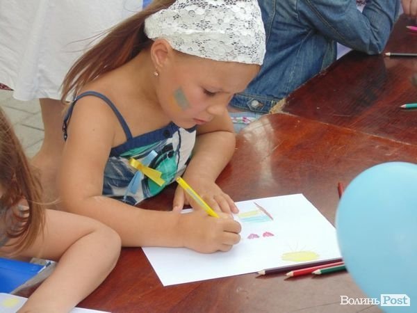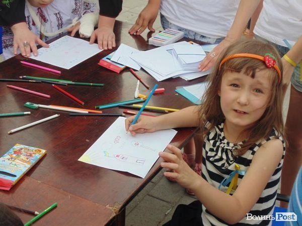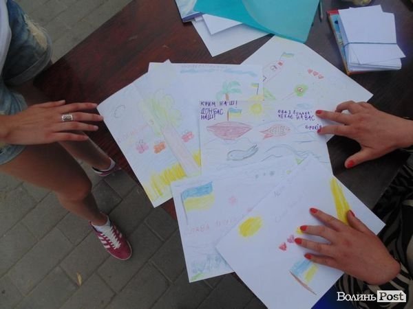 Поряд розташували столи, де діти із шкільного клуб підприємництва «Step by step» Підгайцівської НВК виконують малюнки, які потім відправлять бійцям у зону АТО для моральної підтримки.