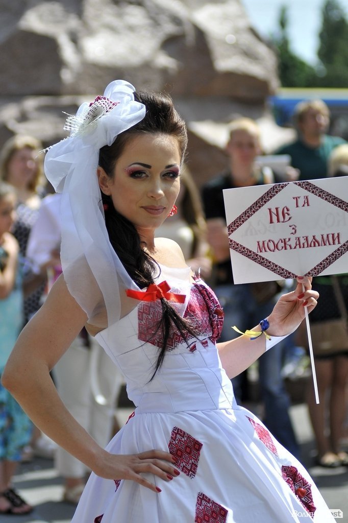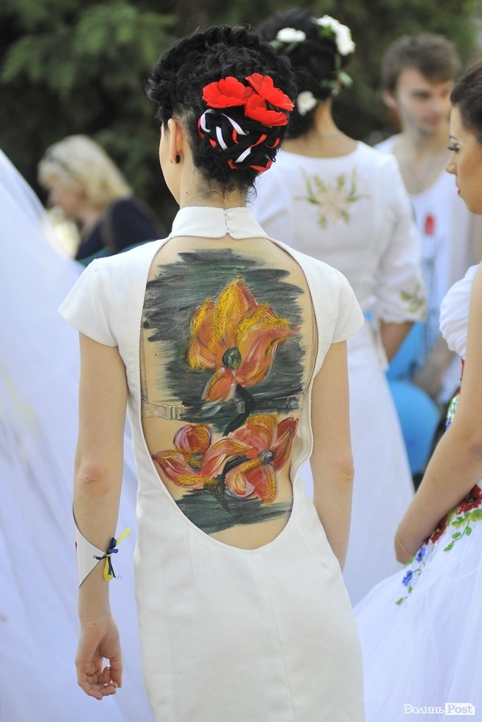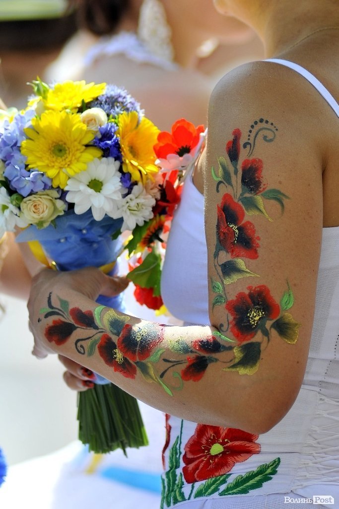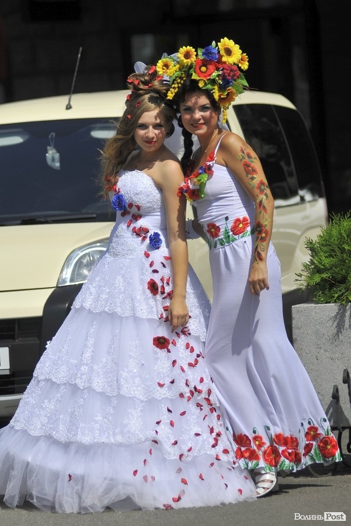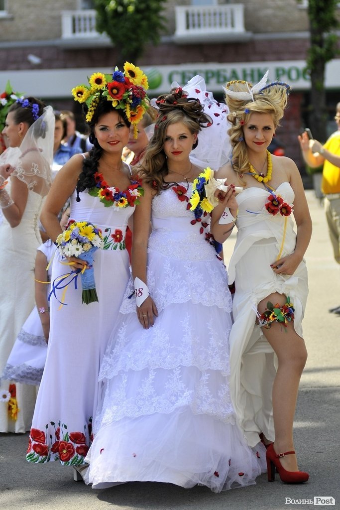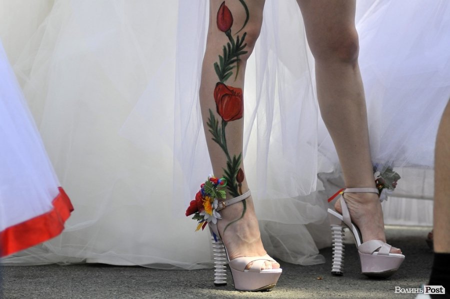 Одягнені учасниці були у весільні сукні з орнаментом української вишивки.
