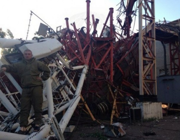 "Вчора близько 23 години терористи вчинили мінометний обстріл позицій АТО на горі Карачун. Одна із мін вибухнула безпосередньо біля телевежі, осколком перебило натяжний трос, що тримав вежу. В результаті вежа нахилилася та впала. Поранених українських силовиків внаслідок обстрілу чи падіння вежі немає", - сказав Дмитрашківський.