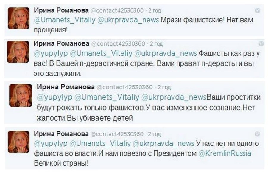 "Мрази фашистские! Нет вам прощения!...Фашисты как раз у вас! В Вашей пидерастичной стране. Вами правят пидерасты и вы это заслужили...Ваши проститутки будуть рожать только фашистов!"