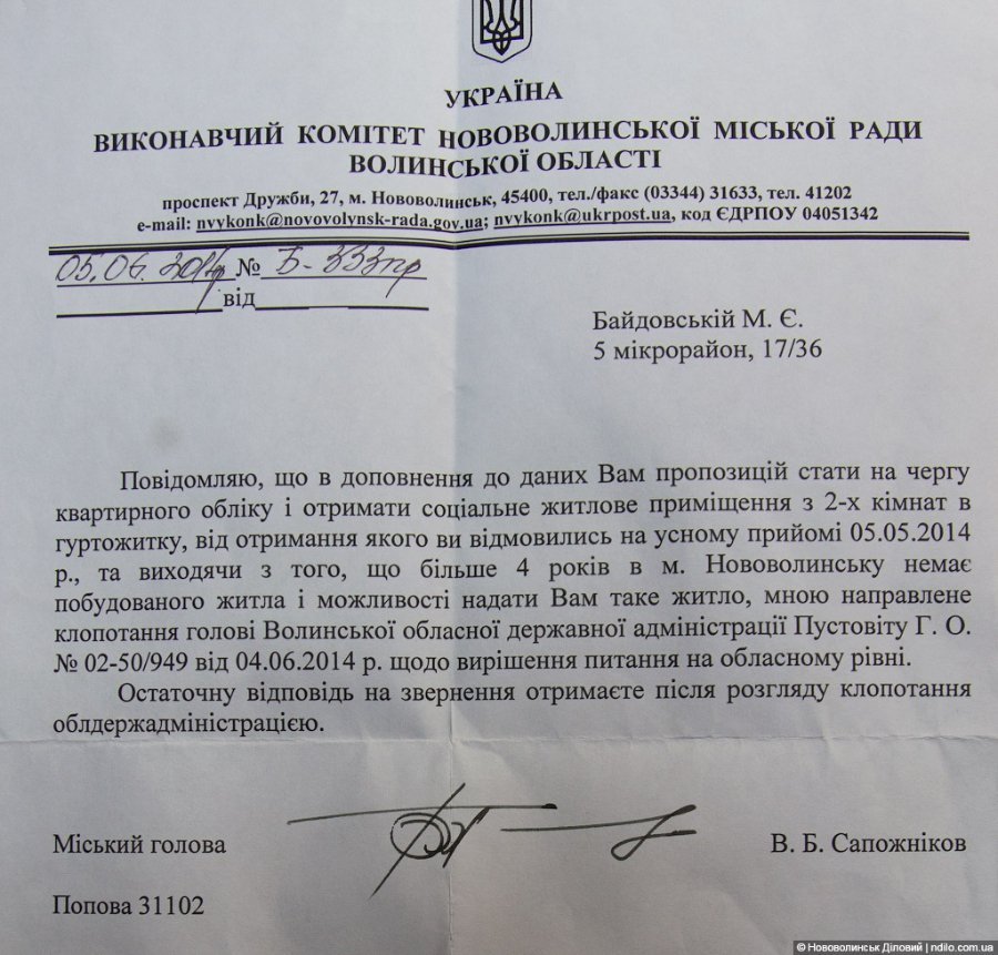 Незабаром після відмови від кімнати у гуртожитку, Марія Байдовська одержала офіційного листа від нововолинських чиновників, в якому зазначалося, що вона відмовилася від 2 кімнат, а тому запропонувати їй якісь інші варіанти мерія не може.