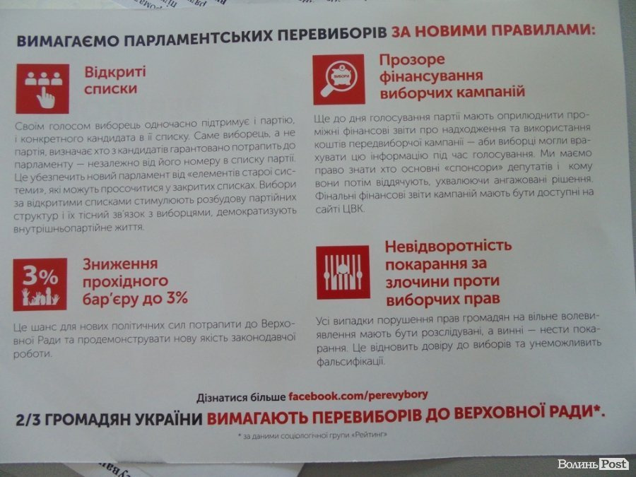 Керівник Центру політичного аналізу та виборчого консалтингу Михайло Наход відзначив, що наразі "Парламент не є органом, який відображає реальні позиції українців", тому він закликав волинян підтримати громадську ініціативу щодо проведення перевиборів.