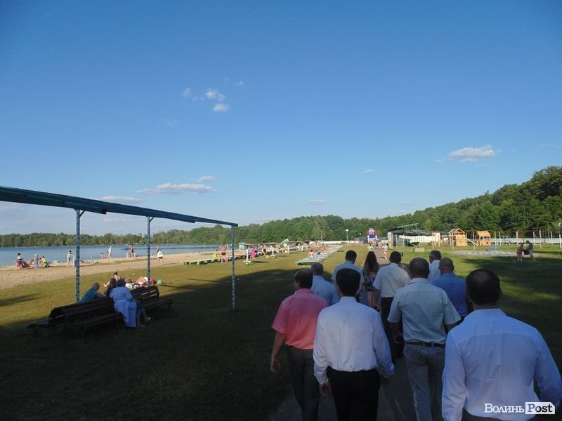 Також у санаторію є свій пляж. Поки багато посадовців знайомилися із видами терапії у лікувальному корпусі, перший заступник голови облради Олександр Пирожик встиг скупатися у озері Пісочному, на березі якого із розташована «Лісова пісня».