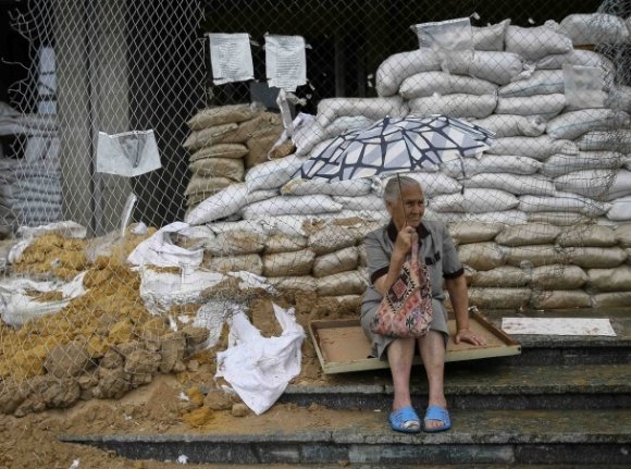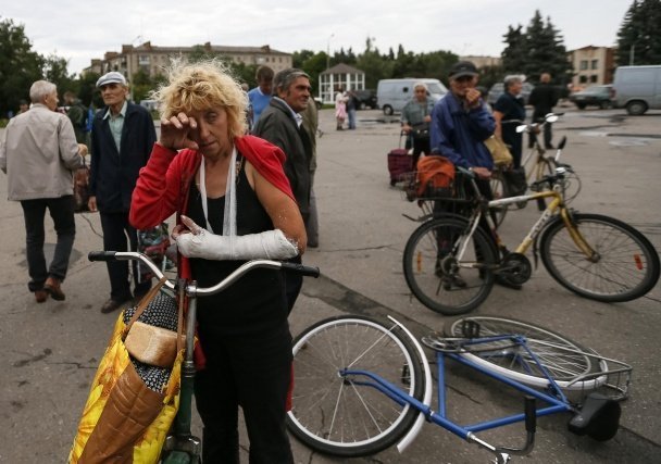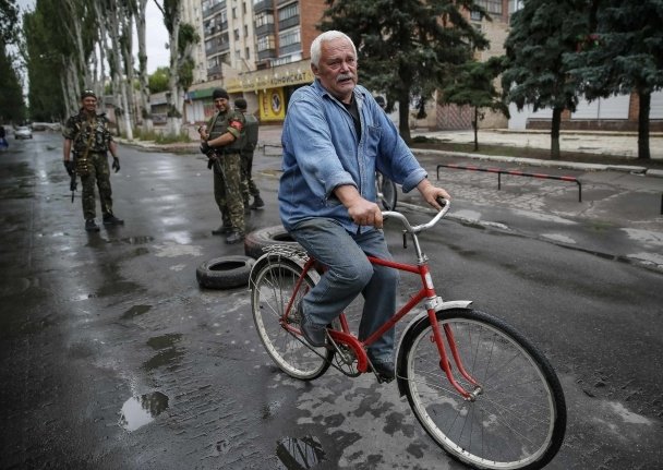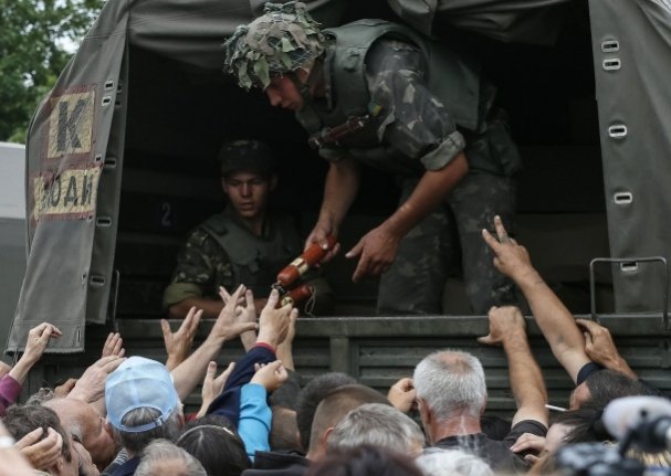 Мешканцям Слов'янська доводилося вистоювати величезні черги біля пунктів видачі продуктів, щоб отримати допомогу.