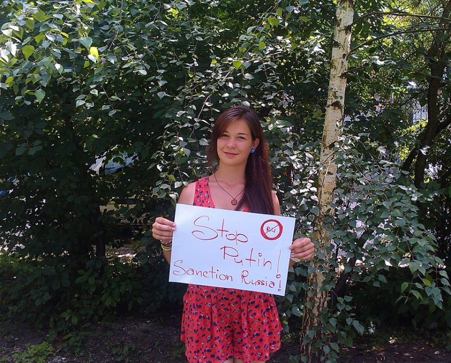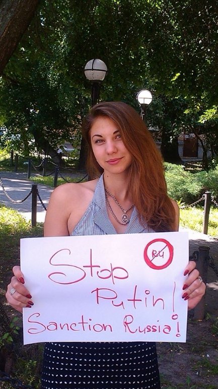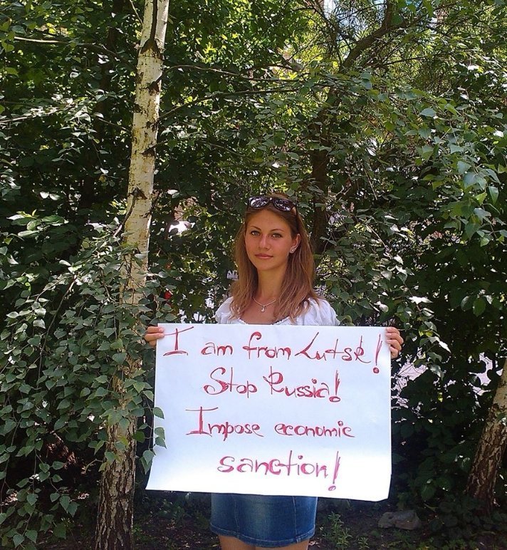 На фото лучани тримають у руках плакати із написами "I'm from Lutsk. Stop Russia. Impose economic sanktion", "Stop Putin! Sanktion Russia", "Stop terrorism in Ukraine! Sanktion Russia!" та іншими із закликом запровадити санкції щодо агресора.