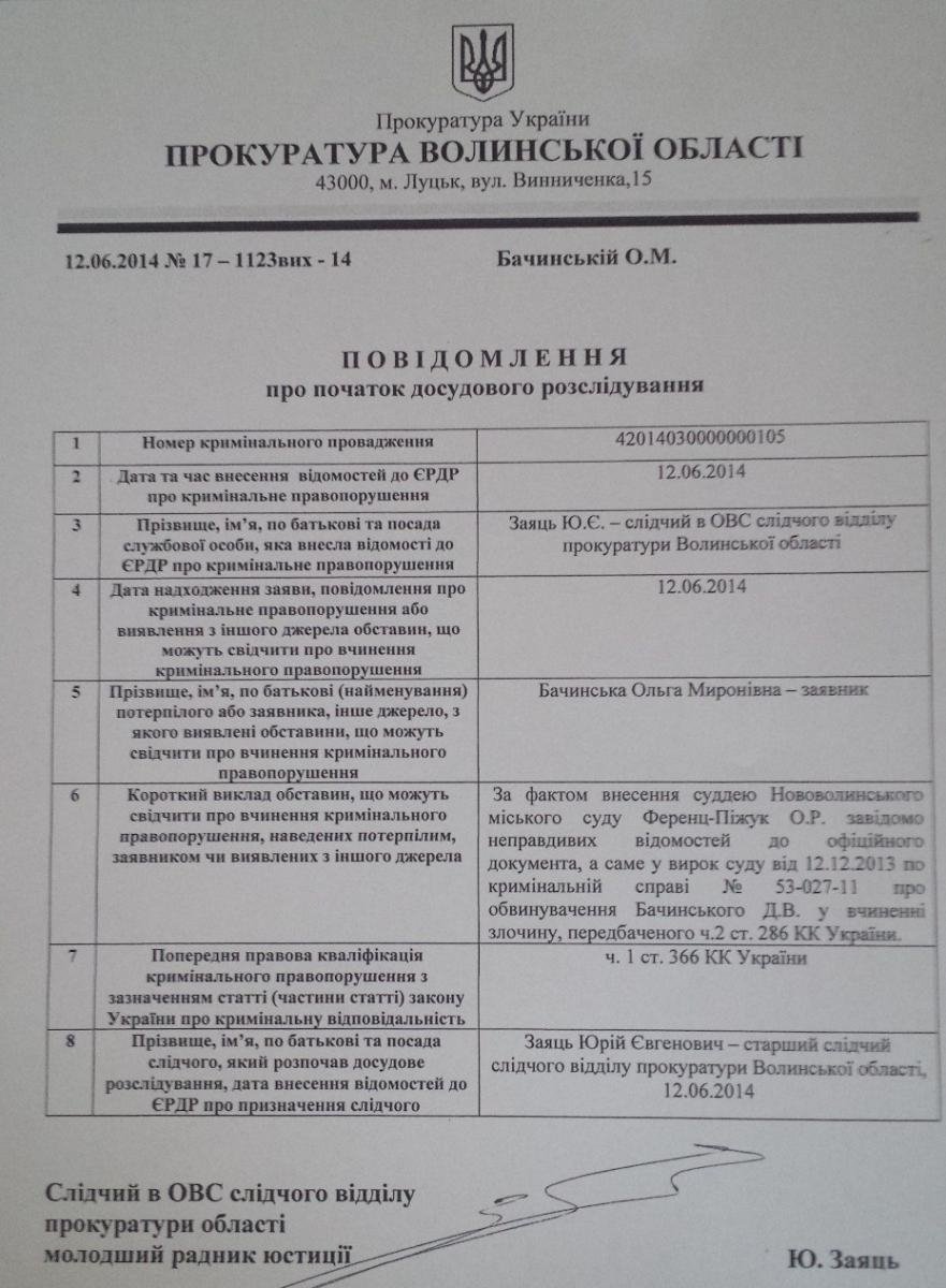 За словами прес-секретаря Волинської обласної прокуратури Наталки Мурахевич, кримінальне провадження проти голови Нововолинського міського суду Орисі Ференс-Піжук відкрито за дорученням Генпрокуратури за фактом можливого внесення суддею завідомо неправдивих відомостей у вирок суду. Розслідування триває, а повідомлення про підозру поки нікому не вручали.