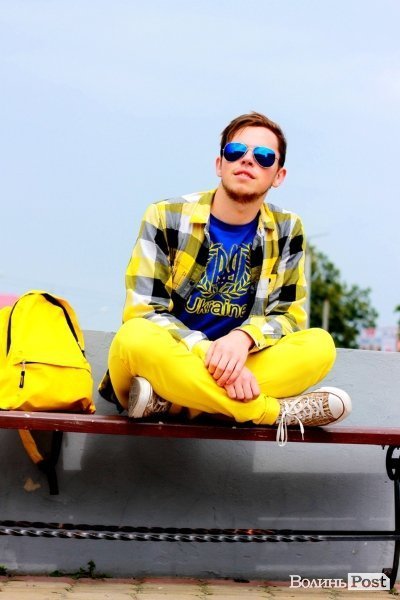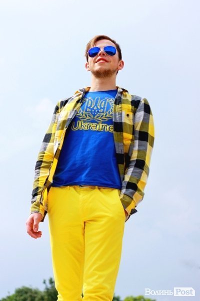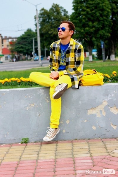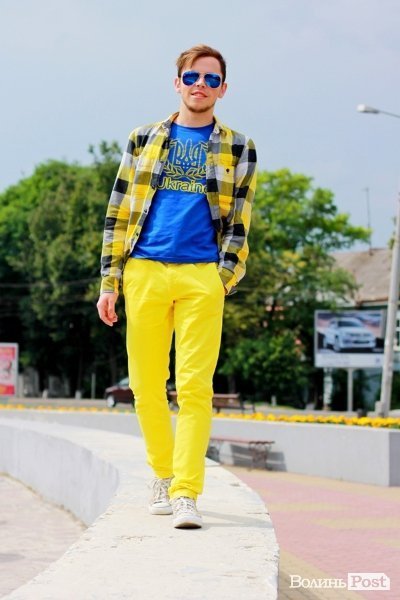 Картата сорочка має гарне поєднання кольорів. Яскраві жовті штани, футболка із національним символом стильно виглядають одне з одним. Модні окуляри вдало поєднуються в образі.