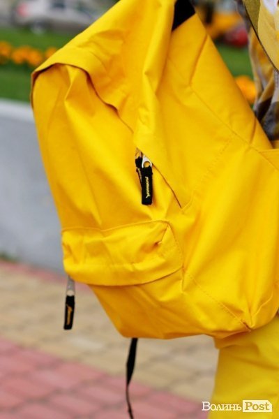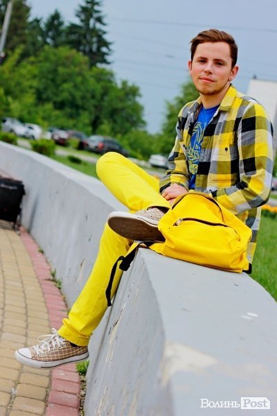 Кеди картаті, але не привертають на себе великої уваги. Також помічаємо модний жовтий рюкзак. Дуже патріотично.
