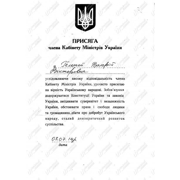Як свідчить оригінал присяги, копію якого надано Верховною Радою на запит "Українських новин", документ має надрукований текст присяги, також ручкою вписано прізвище, ім'я та по батькові Гелетея, а також дату "03.07.14 р.". Однак підпис Гелетея відсутній.