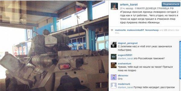 "Дуже швидко після коментарів друзів типу: "Путлер тебе нагородить, розстріл", "Чувак, тебе ще НЕ знайшли за таке? Ховайся поки не пізно", Артем закрив свій профіль в Інстаграм від відвідувачів. Тому зараз залишилися тільки скріншоти. Не подумайте, що Артем - російський дисидент. Судячи з його фотографій і коментарів, він зовсім не проти путінського режиму. Спасибі, Артем, за фотодокази. Не те що б ми не знали, що ці речі відбуваються, але завжди краще побачити, яким чином російська техніка перетинає кордон, ніж почути", - пише блогер.