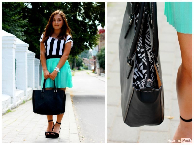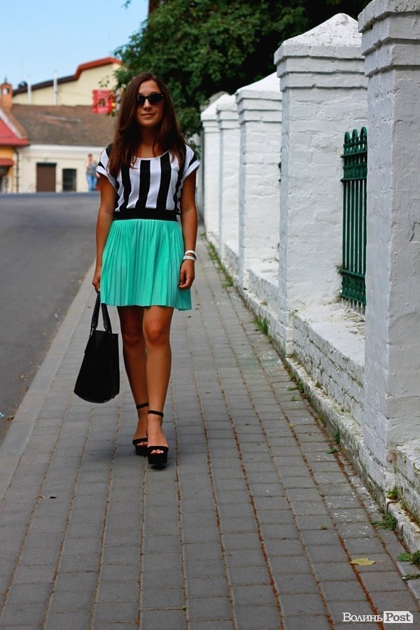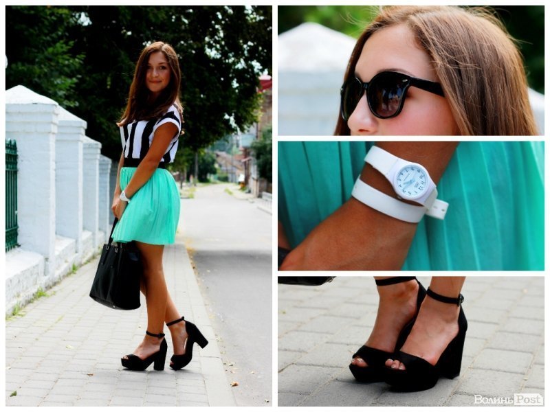 На фото дівчина одягнена у футболку TERRANOVA, спідничку HOUSE, взута була у босоніжки від BERSHKA. Образ прикрашає годинник Q&Q, та сумка David Jones.