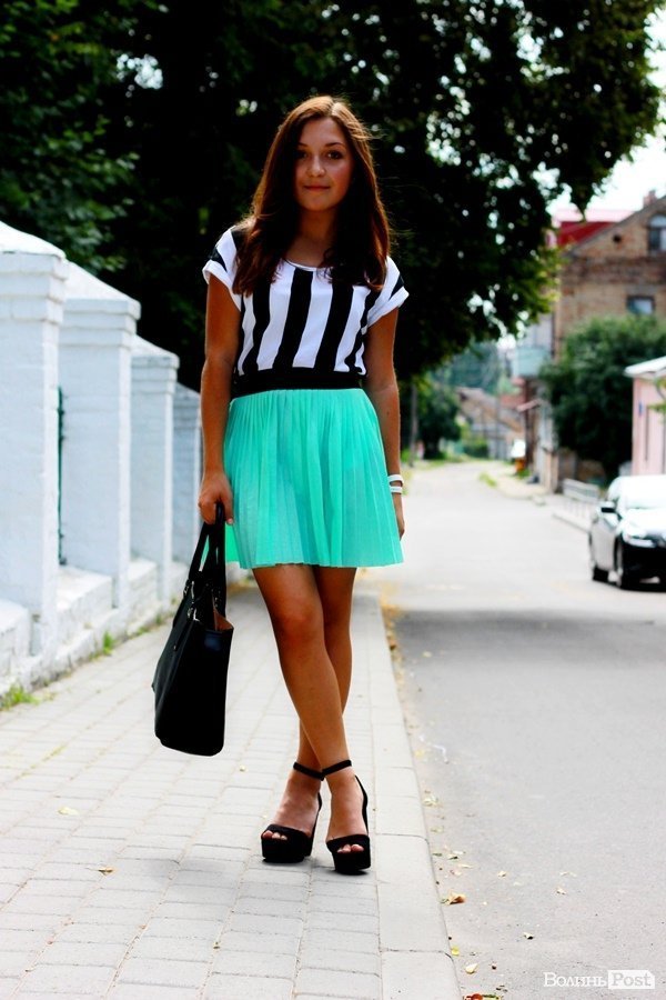 Образ стильний тим, що кофтинка у смужку,спідниця гарної довжини і модного кольору тіфані.