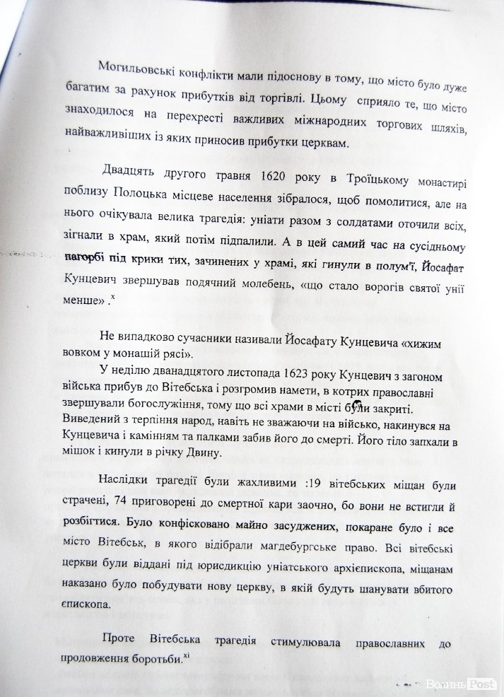 "Й окрім того, у Волинській єпархії наголошують, що у часи, коли жив Йосафат Кунцевич, на Волині тривало насильницьке насадження унії, представником якої якраз і був Кунцевич."