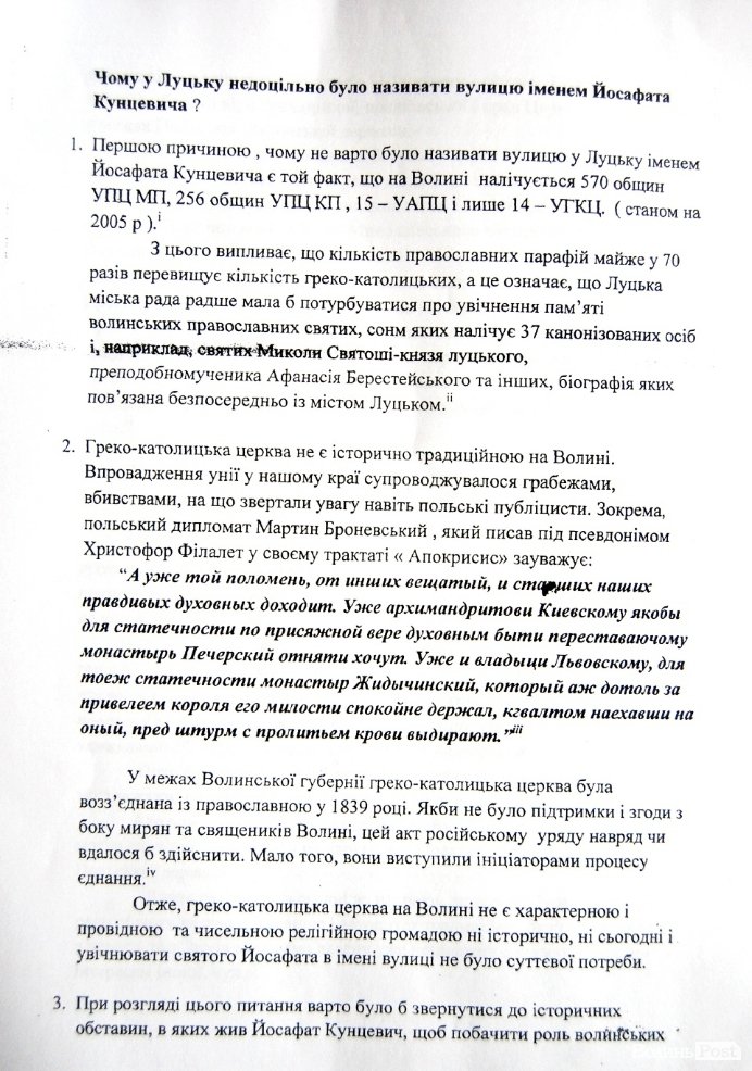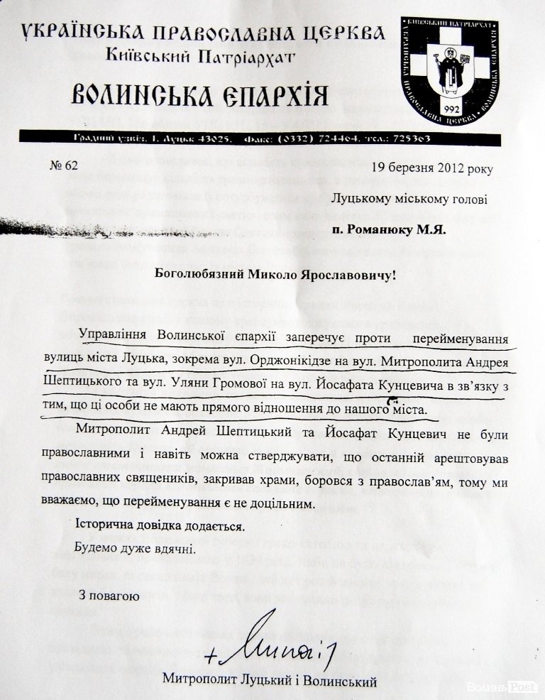«Управління Волинської єпархії заперечує проти перейменування вулиць міста Луцька, зокрема вул. Орджонікідзе на вул. Митрополита Андрея Шептицького та вул. Уляни Громової на вул. Йосафата Кунцевича в зв’язку з тим, що ці особи не мають прямого відношення до нашого міста.