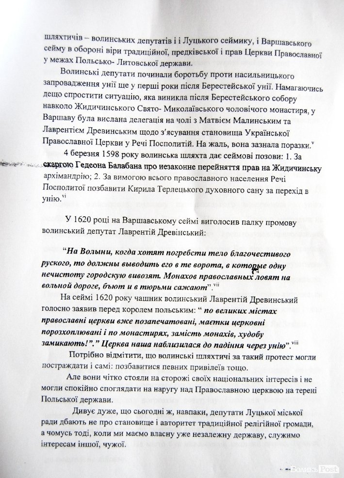 В історичній довідці, доданій до листа, зокрема пояснюється, що на Волині кількість православних парафій майже у 70 разів перевищує кількість греко-католицьких.